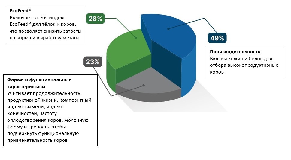 Eco$ — это первый отраслевой индекс, который оценивает продуктивность, эффективность переработки кормов, снижение выбросов метана и использование ресурсов функционально привлекательными коровами, выраженный в долларах за всю жизнь.