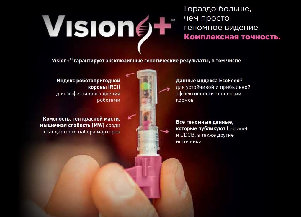 Vision+™ предоставляет эксклюзивные генетические результаты, такие как индекс роботопригодной коровы (RCI), данные Ecofeed®, комолость, ген красной масти, Eco$, A2A2, мышечная слабость, а также все геномные показатели, которые публикуют Lactanet и CDCB.